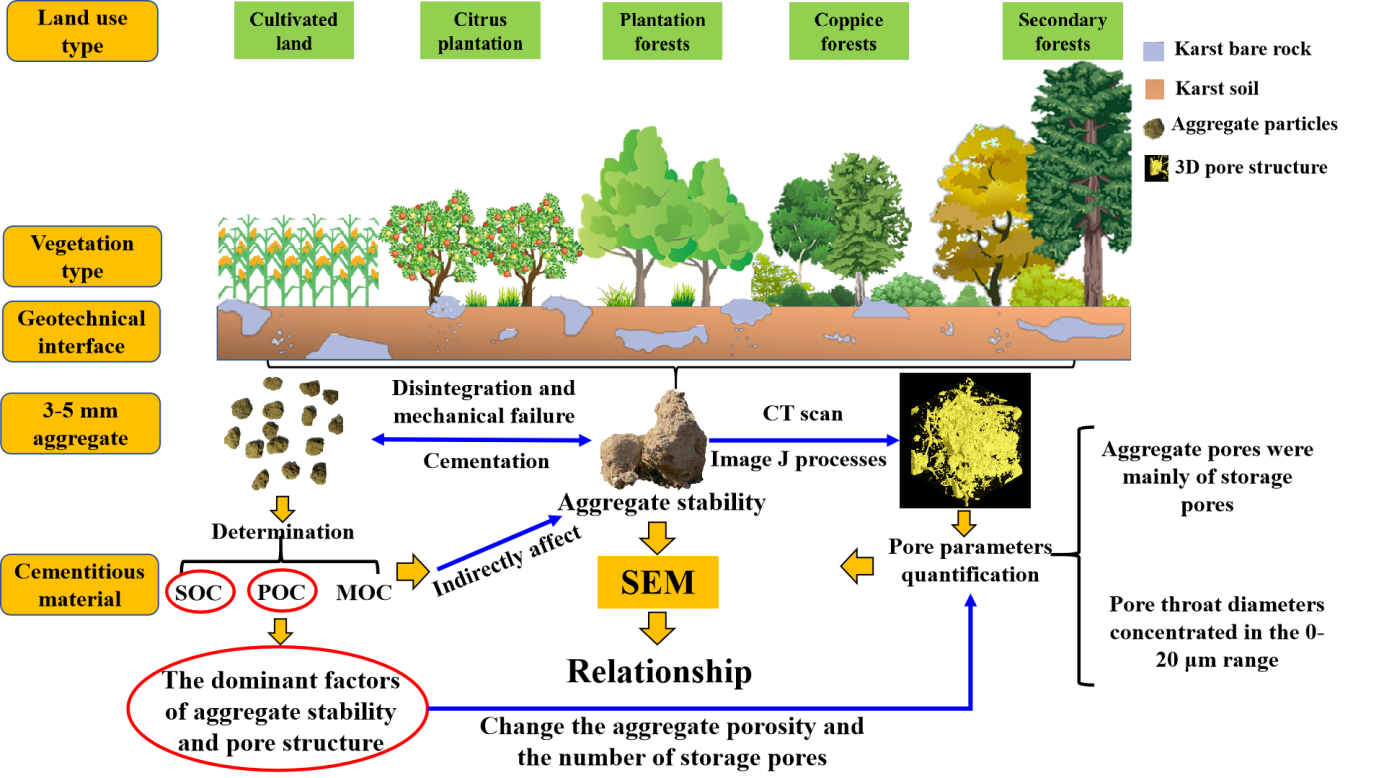 对此,太阳成官网研究团队提出科学假设:喀斯特地区不同土地利用类型下土壤胶结物质含量可能通过影响其孔隙内部结构,进一步造成团聚体稳定性差异。为验证这一假设,研究团队通过CT扫描耕地、果园、人工林、灌木林以及次生林5种最典型土地利用类型的土壤团聚体内部孔隙结构,开展不同土地利用类型中土壤主要胶结物质包括有机碳、团聚体孔隙结构以及团聚体稳定性特征分析,并结合结构方程模型(SEM)对各变量间的耦合关系进行定量分析(图1)。