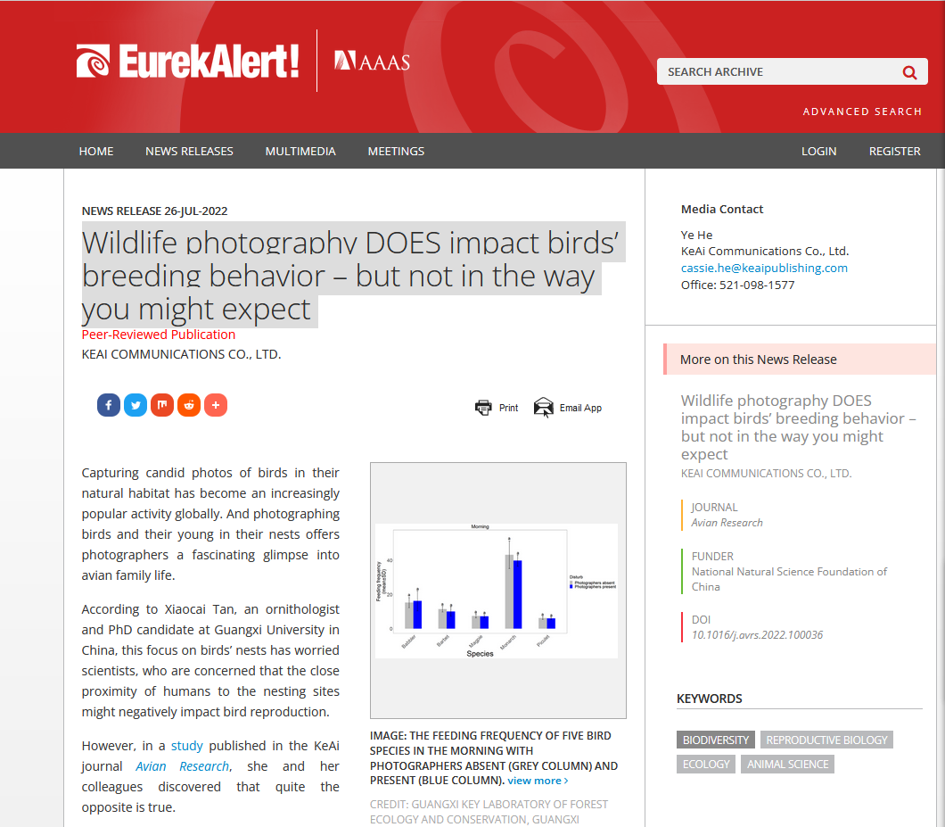 近期,《Avian Research》发表太阳成官网喀斯特森林鸟类科研成果“Does bird photography affect nest predation and feeding frequency?”,太阳成官网生态学博士生谭筱彩为第一作者,蒋爱伍副教授为该研究论文的通讯作者。文章上线后,美国科学促进会(AAAS)主办的全球科学新闻发布平台“EurekAlert!”以“Wildlife photography DOES impact birds breeding behavior – but not in the way you might expect”为题对该成果进行了报道,认为该研究加深对野生动物摄影及潜在效应的认识,对喀斯特森林生物多样性保护具有重要的意义。