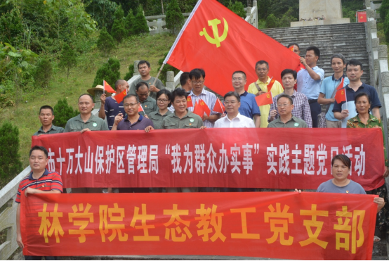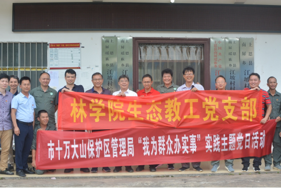 随后,全体党员走进上思县南屏瑶族乡江坡村,开展“听民声、解民忧、纾民困”为民办实事主题实践活动。江坡村位于十万大山深处,是上思县32个贫困村之一,也是自治区级贫困村。活动中,大家聆听了驻村第一书记冯发亮同志对江坡村整体情况的讲解,与江坡村的党员干部进行了学习座谈,详细了解他们在生产中遇到的实际困难,对群众最为关心的金花茶种植、人工林下套种益智等经济作物、以及大面积种植的八角树出现严重退化等问题进行了诊断与答疑,并深入林间地头,实地考察了相关问题,现场讲解,亲自示范,提出解决问题的具体方案。温远光教授及研究团队还主动承担江坡村八角树出现严重退化和病虫害的后期治理工作,积极践行全心全意为人民服务的根本宗旨,切实把“不忘初心、牢记使命”主题教育落实到实处,助力乡村振兴。